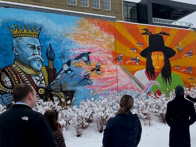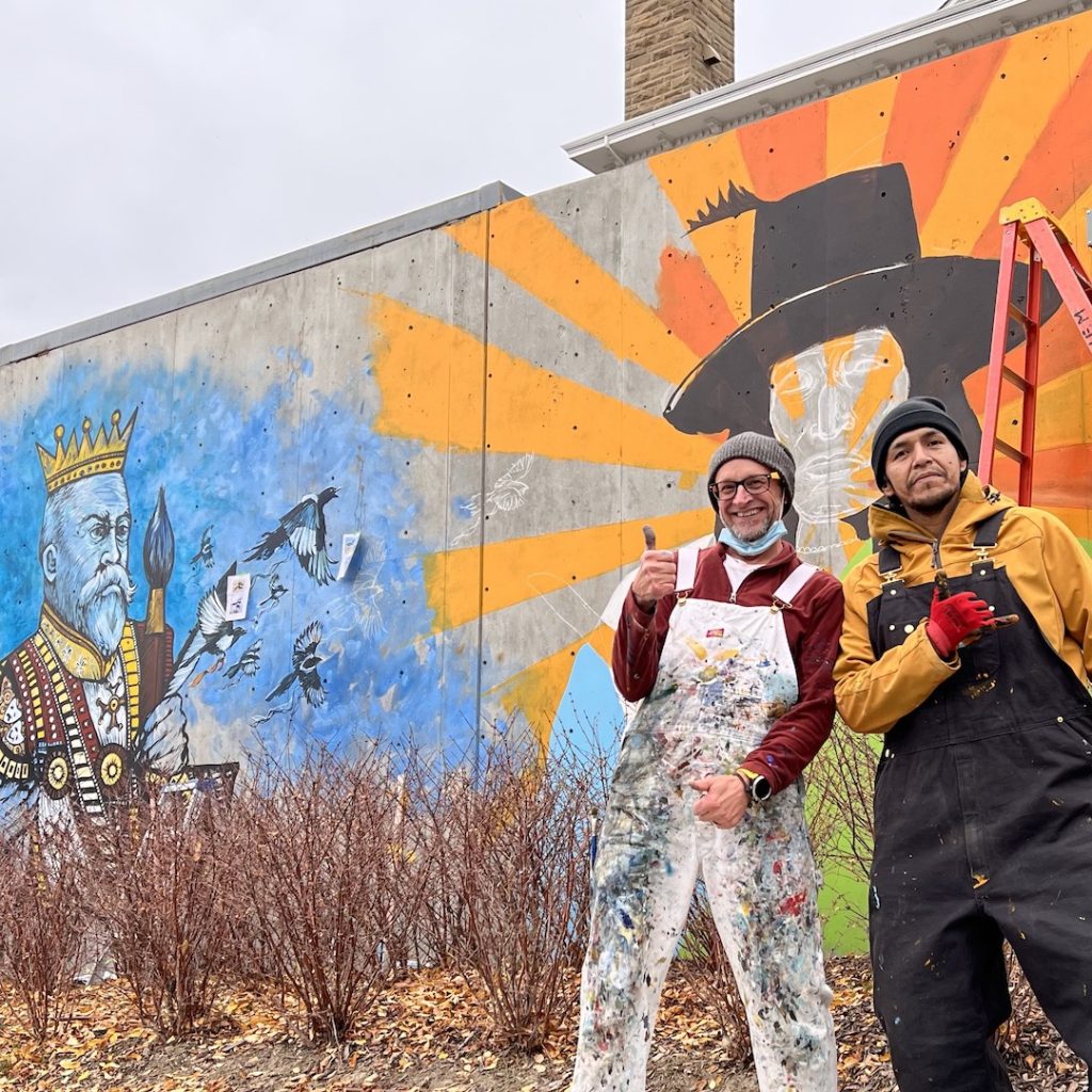- Nathan Meguinis’ We Are All Treaty People – created in partnership with BUMP and muralist Doug Driediger – reimagines a colonial image into a conversation between Chief Bullhead and King Edward VII. Magpies in flight carry ribbons for the children lost to residential schools, inviting all of us to move from history toward hope. View this mural on the North side of cSPACE Marda Loop