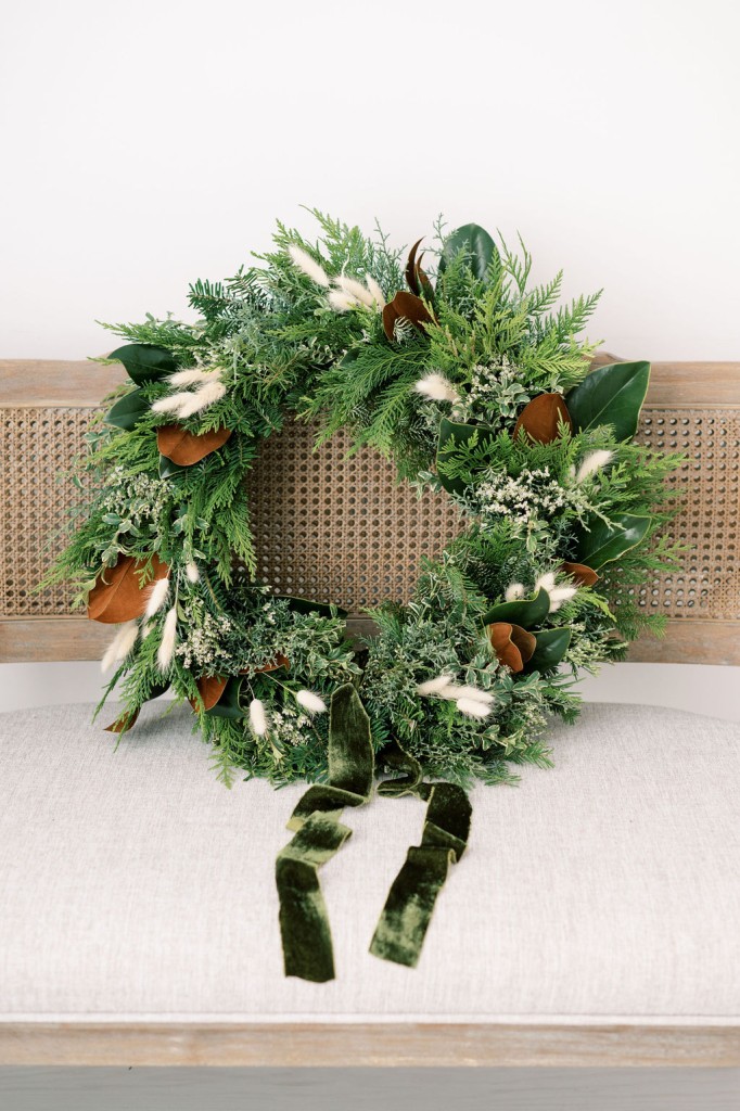 The price includes pre-cut assorted greenery (6+ varieties), pine cones, bunny tail grass, dried florals and/or berries, a spool of paddle wire, a metal wreath frame, and a gorgeous silk velvet ribbon. The metal wreath frame has a diameter of 16 inches, and once the greenery is added, the finished wreath will measure approximately 20–22 inches.