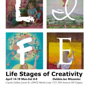 An exhibition of four large scale figurative paintings examining the life stages of creativity through the theories of Robert Root-Bernstein and Michele Marie Root-Bernstein. The paintings by Calgary artist Debbie.lee Miszaniec are from the 2021 series Life: A creative Process. Originally exhibited under pandemic measures, the show was available online but not accessible to the public. This will be the first time these paintings are available for viewing in person. They will be on view in the Cupola Gallery (4th level) at cSPACE Marda Loop from April 14th to April 18th 2026.